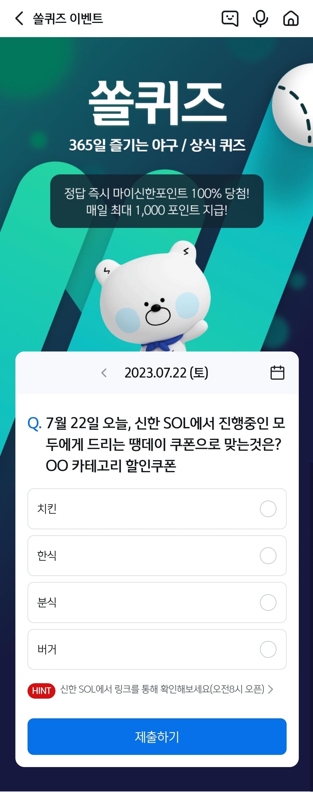 신한 쏠퀴즈(쏠야구), 신한플레이 퀴즈 7월 22일 토요일 정답 알려드립니다.