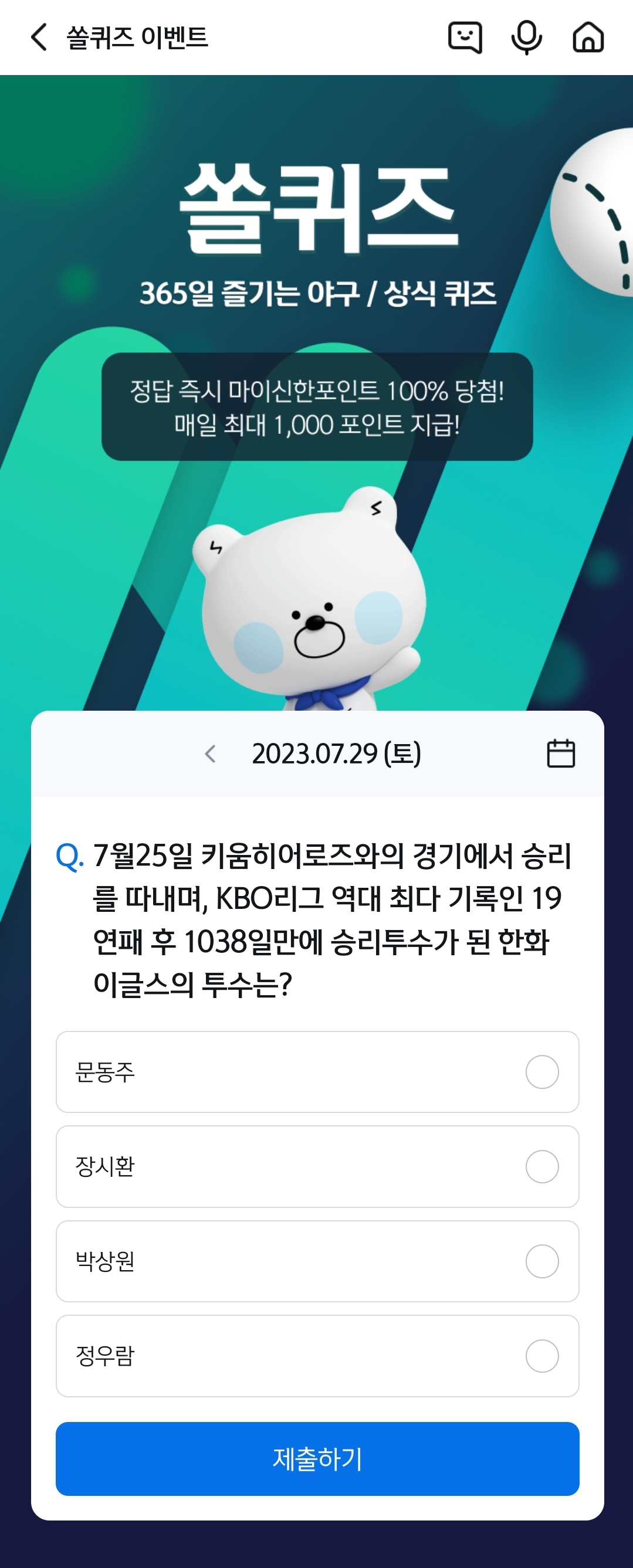 신한 쏠퀴즈(쏠야구), 신한플레이 퀴즈 7월 29일 토요일 정답 알려드립니다.