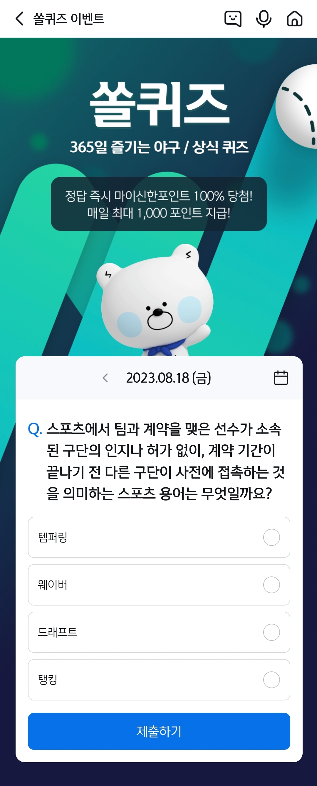 신한 쏠퀴즈(쏠야구), 신한플레이 퀴즈 8월 18일 금요일 정답 알려드립니다.