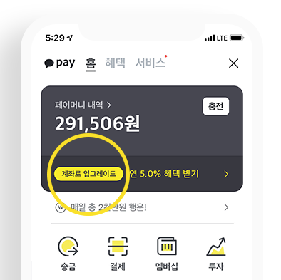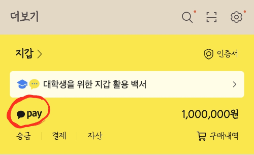 화면 상단을 보시면 카카오페이 항목이 있습니다. 카카오페이 로고를 눌러주세요.